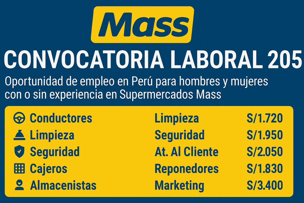 En el dinámico sector retail peruano, Mass se consolida como un referente de crecimiento y oportunidades laborales. La cadena, reconocida por su amplia presencia nacional y su compromiso con el cliente, construye su éxito en el talento y la dedicación de su equipo. representa más que una simple convocatoria; es la puerta de entrada a formar parte de una cultura organizacional que valora la innovación, el servicio y el desarrollo profesional dentro de un entorno de trabajo estable y en constante evolución.