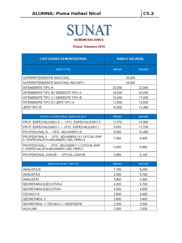 La estructura remunerativa en la SUNAT (Superintendencia Nacional de Aduanas y de Administración Tributaria) está regida por el Decreto Legislativo N° 276, conocido como la Ley de Bases de la Carrera Administrativa y de Remuneraciones del Sector Público, y su posterior reglamento. Los rangos salariales no son de libre acceso público en un desglose detallado por cada puesto, ya que se determinan mediante escalas y niveles dentro del régimen público. La remuneración total se compone del sueldo básico, asignaciones (por escolaridad, por lugar de trabajo, etc.) y bonificaciones específicas (por productividad, por función crítica). Los montos exactos dependen de factores como el grupo ocupacional, el nivel y los años de servicio. Los puestos de mayor jerarquía, como los de confianza (Directores, Superintendentes), tienen una remuneración fijada mediante resoluciones supremas y suelen estar en los tramos más altos del escala única de sueldos del sector público.