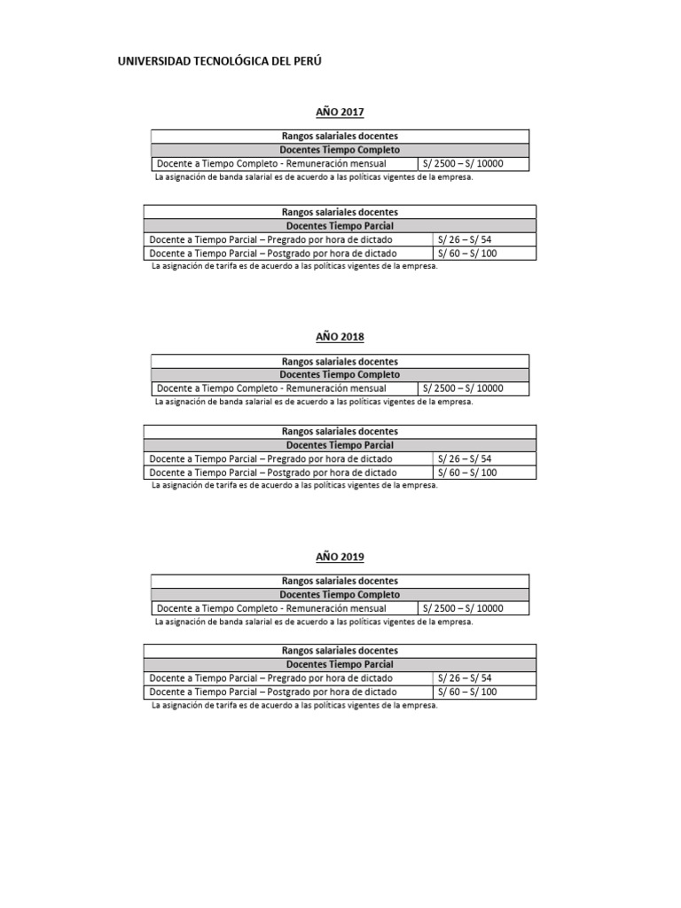 La Universidad Tecnológica del Perú (UTP) no publica de manera oficial una estructura salarial unificada o rangos remunerativos por hora detallados para todos sus colaboradores. La remuneración varía significativamente según el tipo de contrato, la ubicación geográfica, la experiencia, la formación académica y la posición específica dentro de la organización. Sin embargo, se pueden identificar las categorías principales y los rangos aproximados basados en ofertas laborales públicas y el mercado educativo peruano.